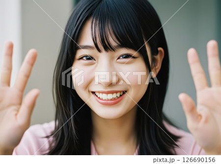 笑顔で手を振る明るく親しみやすい雰囲気の若い女性(AI生成画像)