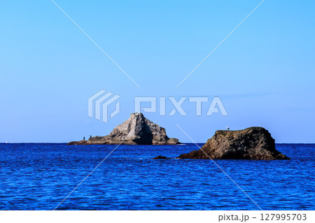 ヒリゾ浜渡船に乗って出港するスキンダイバー、シュノーケラー。 青い海と無人島の大根島、岩礁が見える。