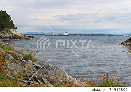 遠くにタンカーの見える北欧の入江, ホルダラン, ノルウェー