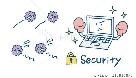 セキュリティソフトでコンピューターウイルスを防ぐパソコンの手書きイラスト