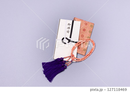 仏事イメージ/香典袋と数珠と袱紗