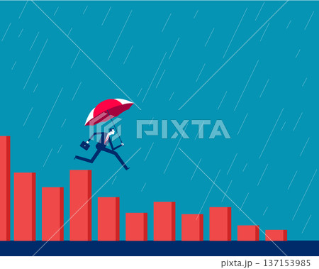 Financial insurance. Businessman with umbrella falling from the heights of the bar chart to the lows
