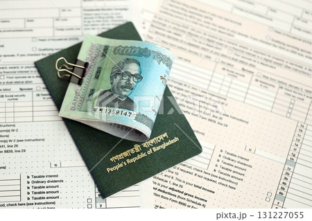 Bangladeshi taka money bills lies on table with pen, calculator, passport and tax forms