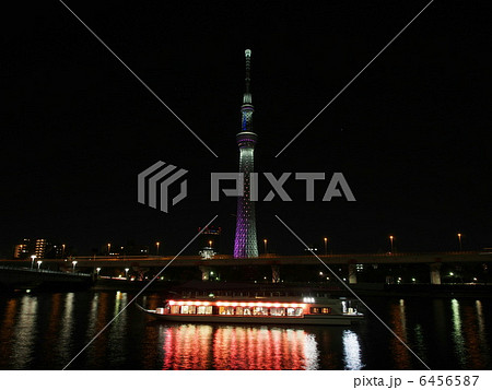 東京スカイツリー冬雅と屋形船の浮かぶ隅田川の夜景