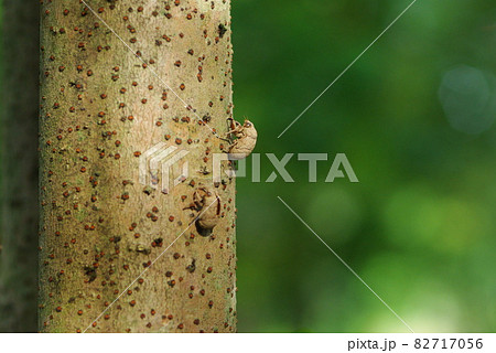 雑木林のクヌギの木に登った蝉の抜け殻の生態写真