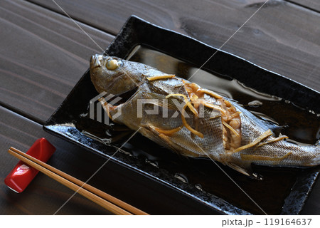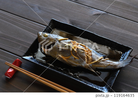 縞伊佐木 シマイサキの素材写真 ザルの上の魚