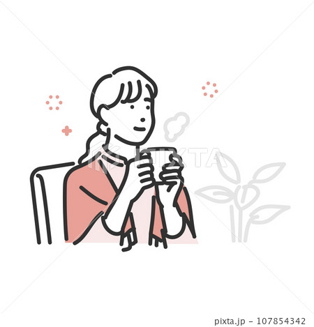 リラックスして暖かい飲み物を飲む女性のシンプルな線画イラスト