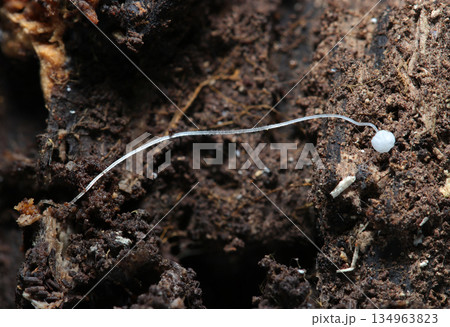 朽木土壌に極細極小2cmほど、真っ白半透明のクヌギタケ属茸のヒダと柄(自然環境下マクロ撮影)