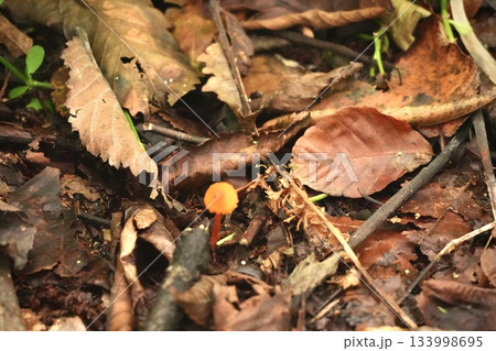 落ち葉の森にひっそりと輝くオレンジの小さなキノコ