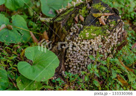 朽ち木の幹に育つクヌギタケ