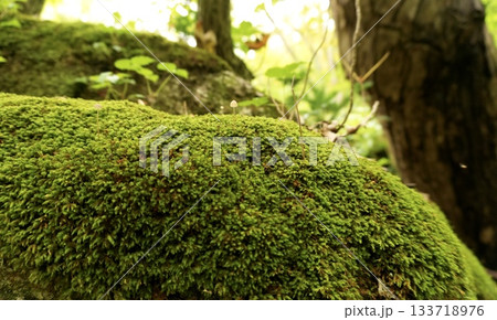 苔むした倒木と小さなキノコの森のテクスチャ