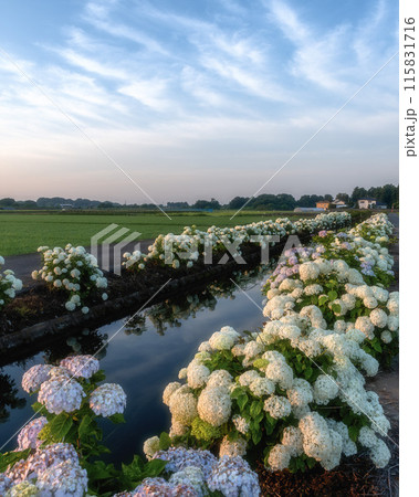 アナベル咲き誇る小川の朝