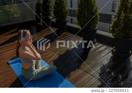 A woman practices yoga poses on a rooftop in an urban setting, wearing headphones