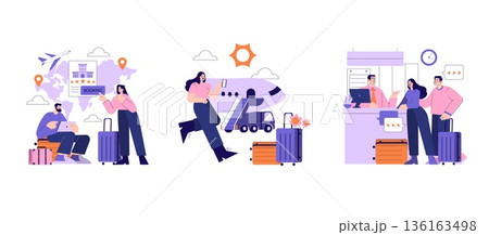 Vector illustration depicting travel stages: booking flights, heading to the airport, and checking in. Individuals are engaged in travel-related activities, illustrating the journey from planning to
