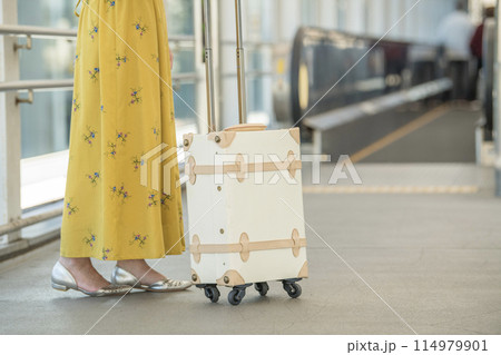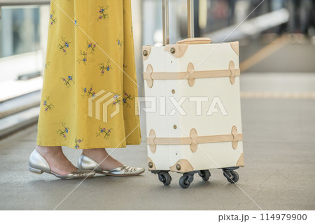 Start of her journey. Beautiful young woman ltraveler in a yellow dress and a yellow suitcase is