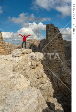 Active hiker hiking, enjoying the view, looking at Dolomites mountains landscape