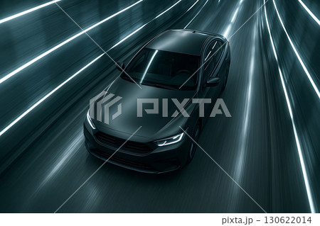 光の軌跡を駆け抜けるマットブラックのセダン車体「AI生成画像」