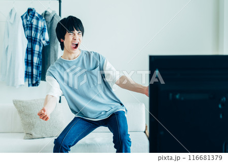 リビングでテレビを見る若い男性