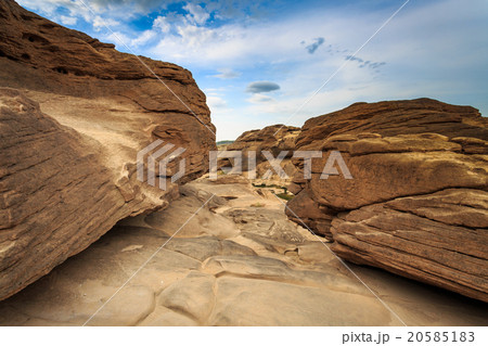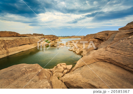 Tourist sitting at Sam Phan Bok in Ubon ratchathani, Thailand. Grand canyon of Thailand.