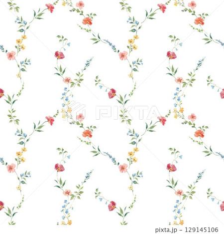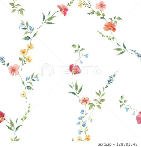 Seamless watercolor floral pattern with hand-painted wildflowers and leaves. Soft pink, yellow, and blue blossoms. Ideal for wallpaper, fabric, nursery decor, and spring-themed designs.