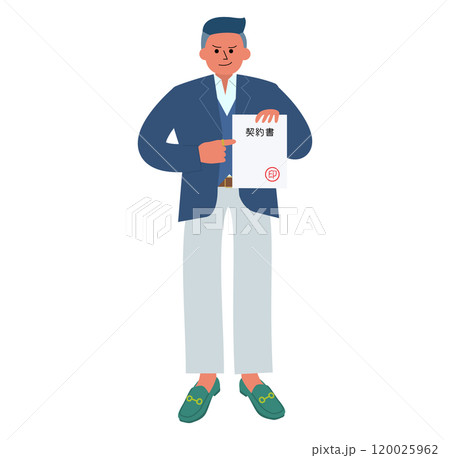 契約書に捺印していることを主張するツーブロックのフォーマルな格好をした威圧的な男性の全身のイラスト