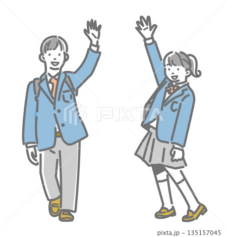 学ランとセーラー服を着た男女 学生が手を振るベクターイラスト素材