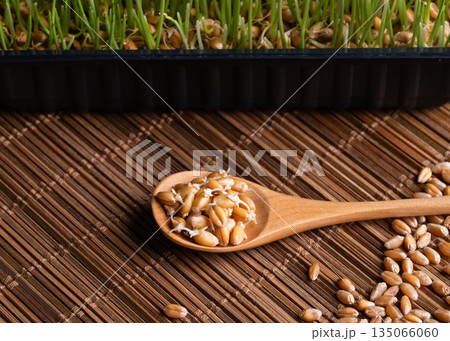 Top view of organic sprouted wheat grains on a light rustic wooden background. Concept of healthy living, raw food, vegan diet, detox, natural probiotics and vitamins.