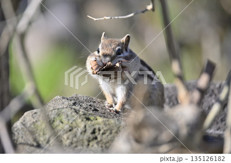 落ち葉を集めるシマリス 冬支度 冬眠