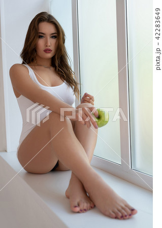Sexy brunette in white top shot on a window sill