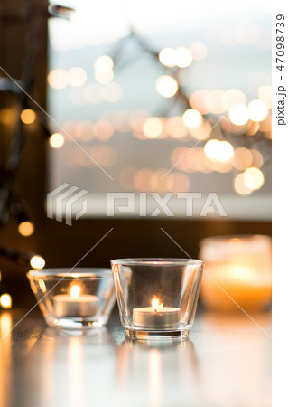 candles burning on window sill with garland lights