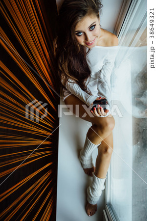 Pretty brunette girl sitting on window sill with