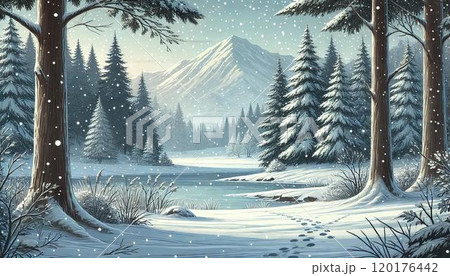 【北欧風】雪が積もる冬の森と夜空の幻想的な風景イラスト