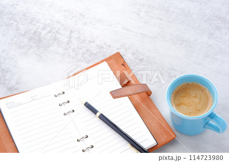 ミルクをたっぷり入れたコーヒー、カフェ・オ・レを飲みながら、システム手帳でデスクワーク中のイメージ