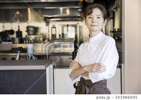 レストラン厨房前で腕組みをするベテラン女性シェフ