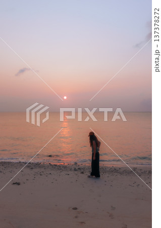 夕焼けの海辺を歩く女性のシルエット