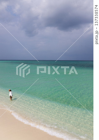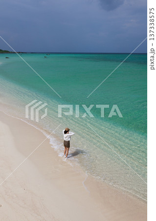 17ENDの白い砂浜とターコイズブルーの海に立つ女性