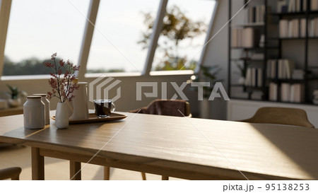 Close-up image, Empty copy space on wooden dining table in minimal and cozy home living room