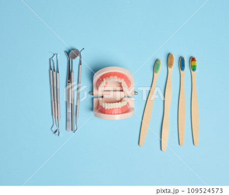 Plastic model of human jaw with white even teeth and a medical examination mirror, tweezers