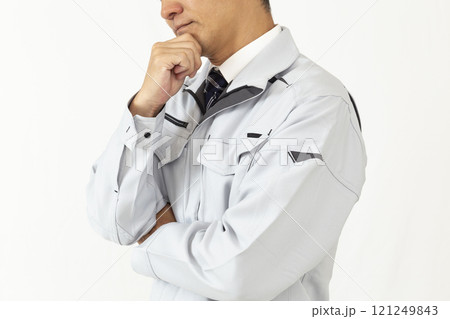 作業着を着て考え込む男性 白バック