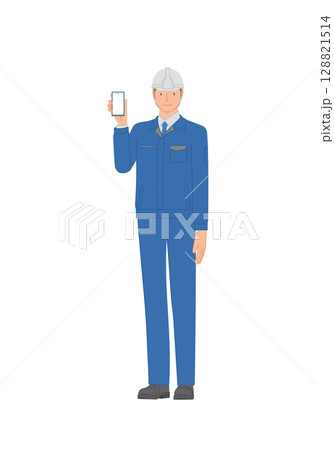 ビジネスイメージ:作業服とヘルメットを身に付けた笑顔の若い男性:スマホを持っている
