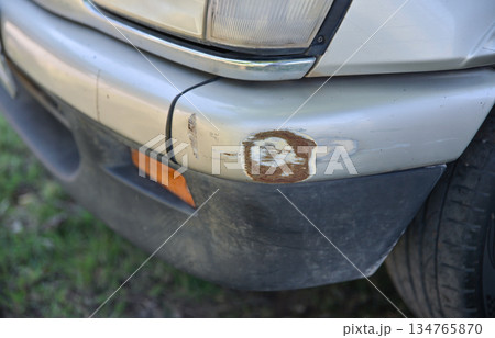 Close-up of red car front bumper showing visible scratches and paint damage parked on concrete road in urban alley with fallen leaves