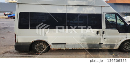 White commercial van with significant rust and flat tire parked on urban street, vehicle showing signs of disrepair and neglect, side view