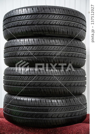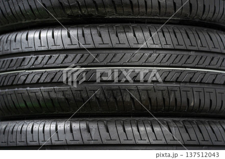Stacked used car tires in black and white texture of worn rubber treads automotive recycling