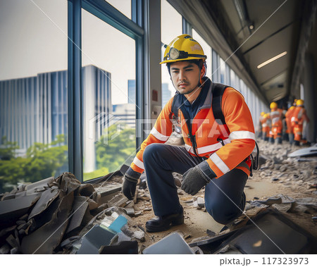 瓦礫の前でヘルメットをかぶった男性のイメージ素材