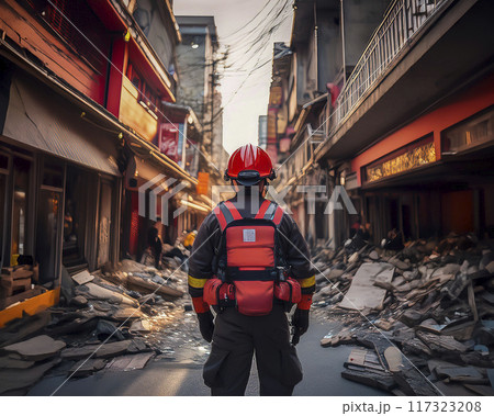 瓦礫の前でヘルメットをかぶった男性のイメージ素材 商店街