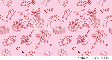 Romantic journey and love story seamless pattern on pink background, vintage tandem bicycle and record player hand drawn doodle vector wallpaper