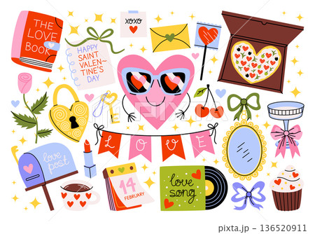 Set of romantic Valentine's Day stickers. Love, infatuation, passion, heart character, champagne glass, mug, calendar, key, lock, heart-shaped pizza, cupcake. Illustrations for weddings, celebrations.