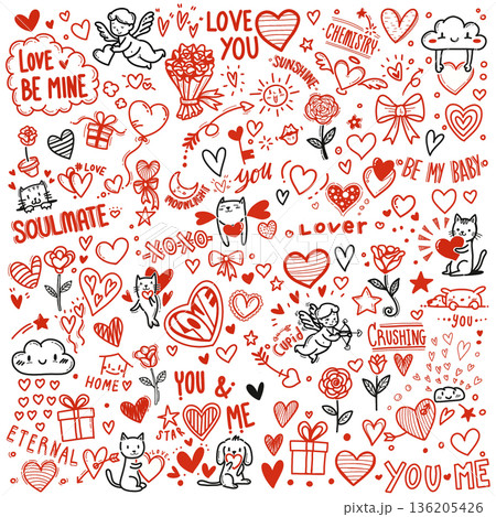 set of cute drawing cartoon of Valentine with heart, cupid, pet, text outline isolated on white background