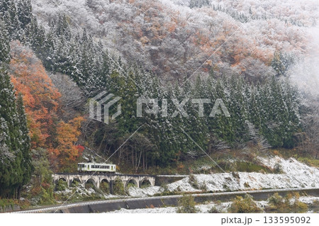 只見線 紅葉が美しい朝の第一只見川橋梁を渡る列車(福島県三島町、11月)